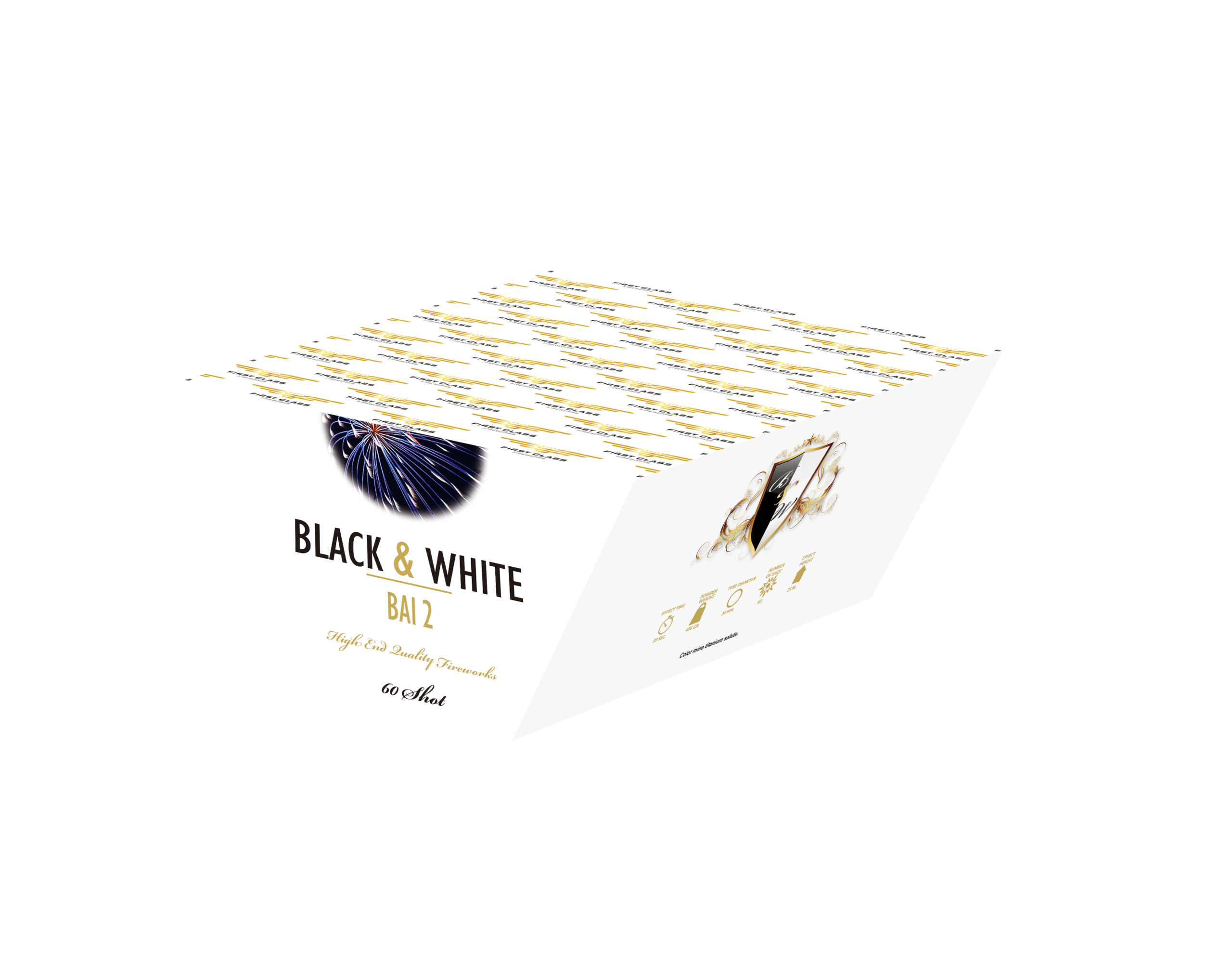 Bai 2 fra Black & White serien hos First Class Fireworks er et 20 mm batteri med 60 skud og 456 g krudt, der udelukkende indeholder knaldfyrværkeri. Batteriet er skabt til dem, der elsker det øredøvende brag og intensiteten, når himlen fyldes med kraftfulde lyde.