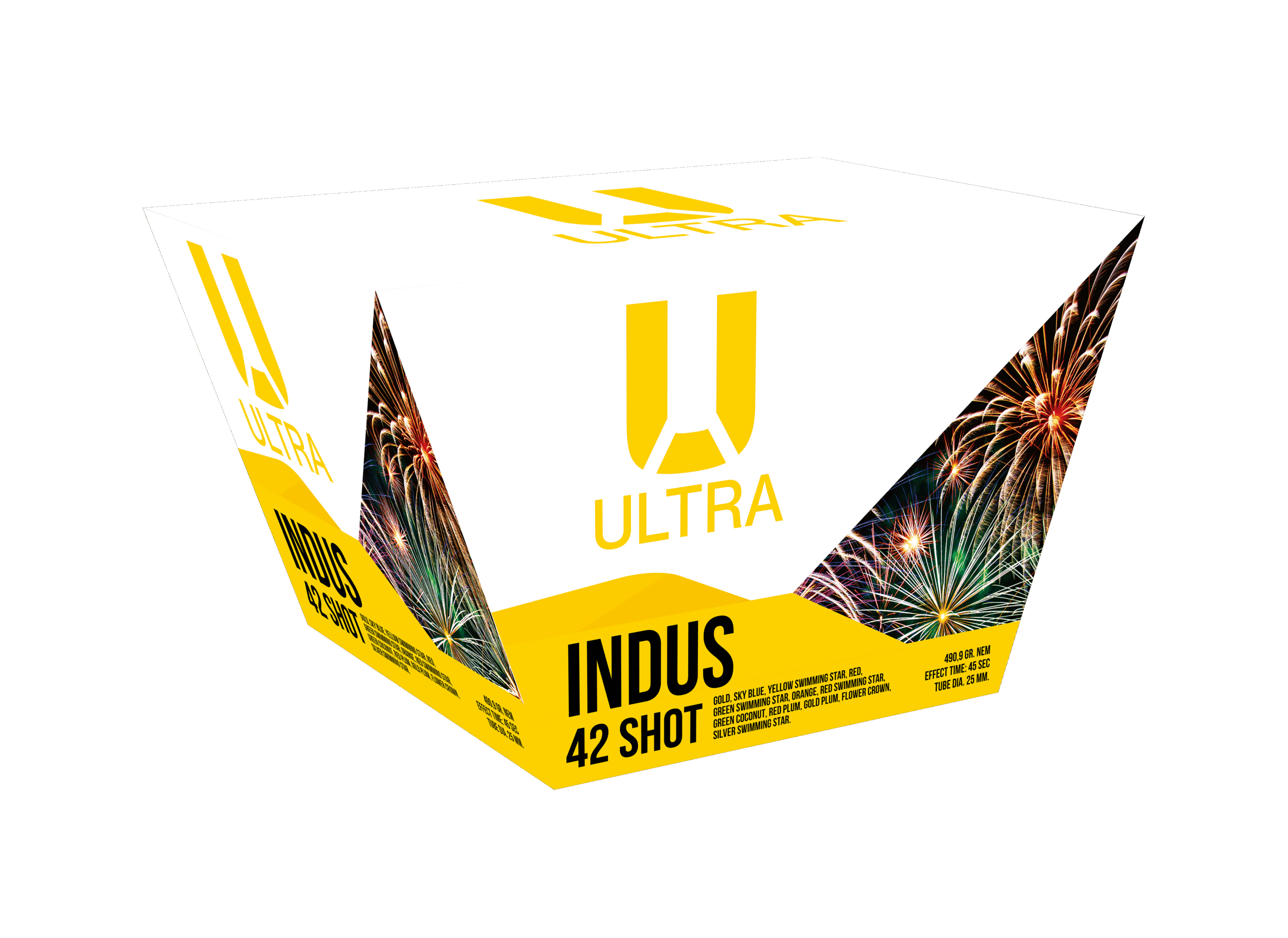 Indus fra Ultra serien hos First Class Fireworks er et 25 mm fest-batteri med 42 skud og en samlet krudtvægt på 490 g. Batteriet er designet til nytårsaften og leverer et langt, kraftfuldt og visuelt imponerende show, der sætter stemningen for aftenen.