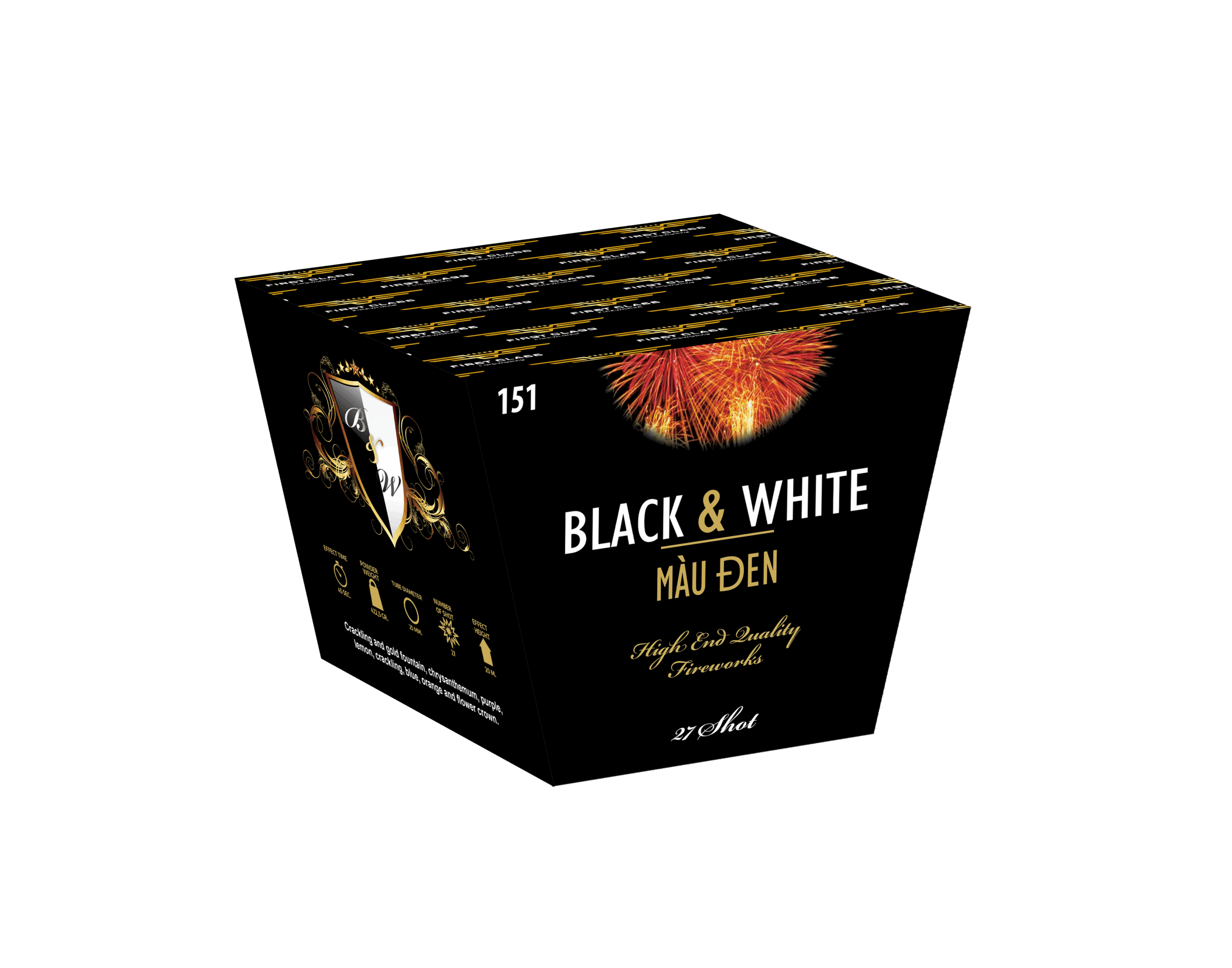 Màu Den fra Black & White serien designet af First Class Fireworks er et 26 mm øredøvende salutbatteri med 25 skud og 422 g krudt. Batteriet er skabt til drengerøvene, der elsker det hårde brag og det intense tryk, når nattehimlen eksploderer i hvidglødende lys.