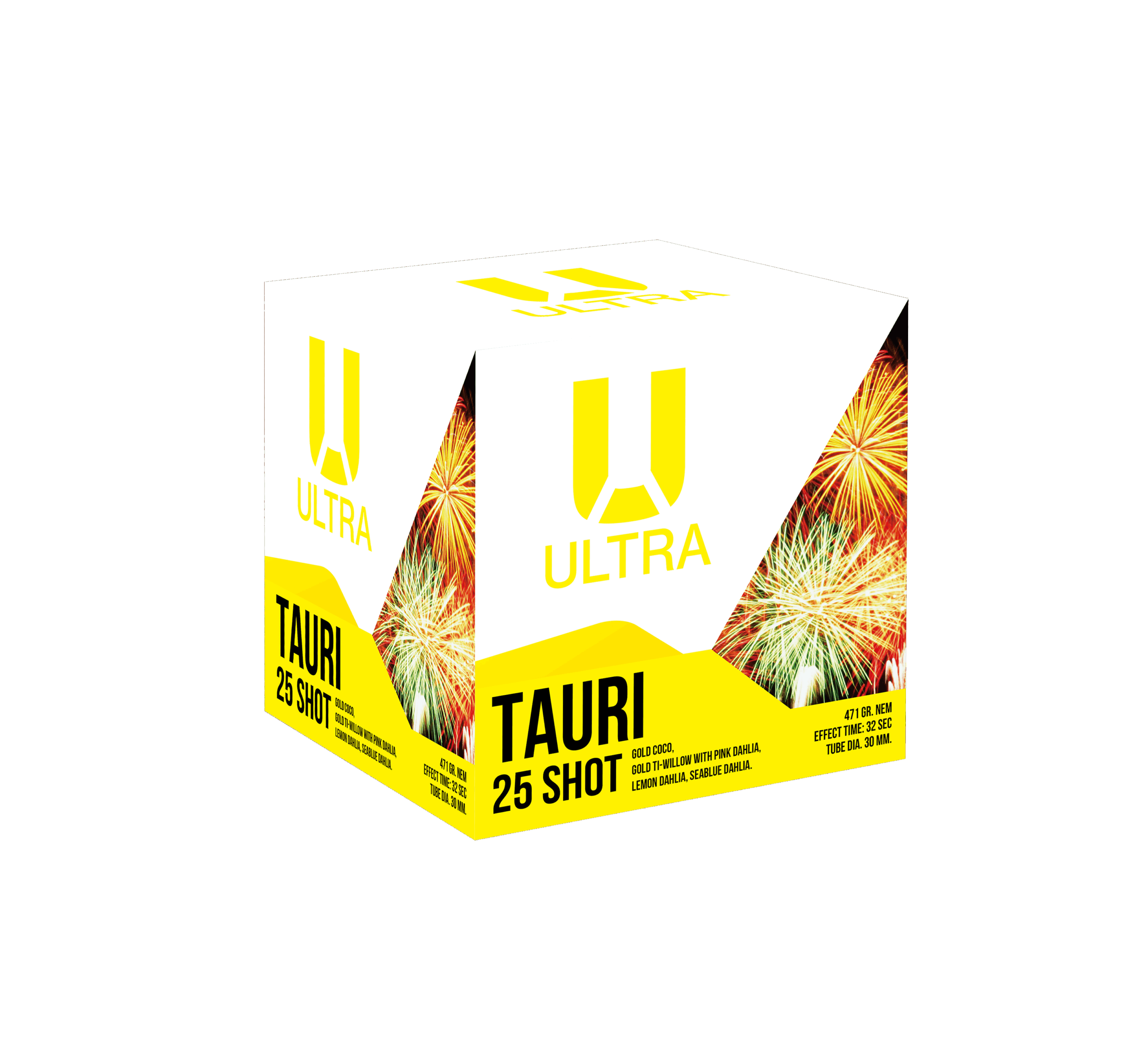 Tauri fra Ultra serien hos First Class Fireworks er et 30 mm kvalitetsbatteri med 25 skud og en samlet krudtvægt på 471 g. Batteriet er designet til nytårsaften og leverer et kraftfuldt og visuelt imponerende show med guld-titanium effekter, som fylder himlen med elegance og styrke.